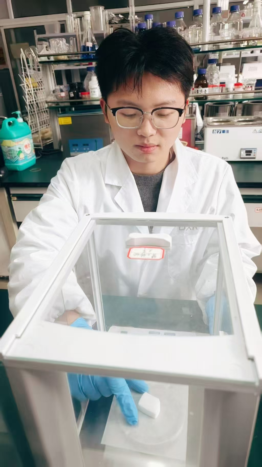 戴晓康的科研之旅始于大一。彼时初入大学校园,面对陌生的专业领域,他并未迷茫太久。在导师袁炳楠老师的悉心指导下,他迅速走进实验室,投身课题研究。从最基础的画图、3D建模学起,到独立完成材料制备、性能测试与机理分析,他在实验室的实践中一步步成长为一名优秀的研究者。他所研发的是一种以生物质纳米纤维素(CNF)和聚乙烯醇(PVA)为基材,并引入大尺寸碳纳米片的功能性复合泡沫材料。这种新型材料不仅具备优异的机械强度与高透光率,更拥有一项独特功能——能将紫外线转化为蓝紫光,实现“光补偿”效应,从而有效改善室内光照质量。这一成果有望应用于绿色建筑、健康照明等领域,展现出广泛的应用前景。然而,通往成功的道路从来不是一帆风顺,研究中最难攻克的环节,是对材料结构与性能关系的机理阐释。为此,他花了整整三个月时间查阅文献、反复推演,最终构建起完整的理论框架,为研究成果提供了坚实的科学支撑。